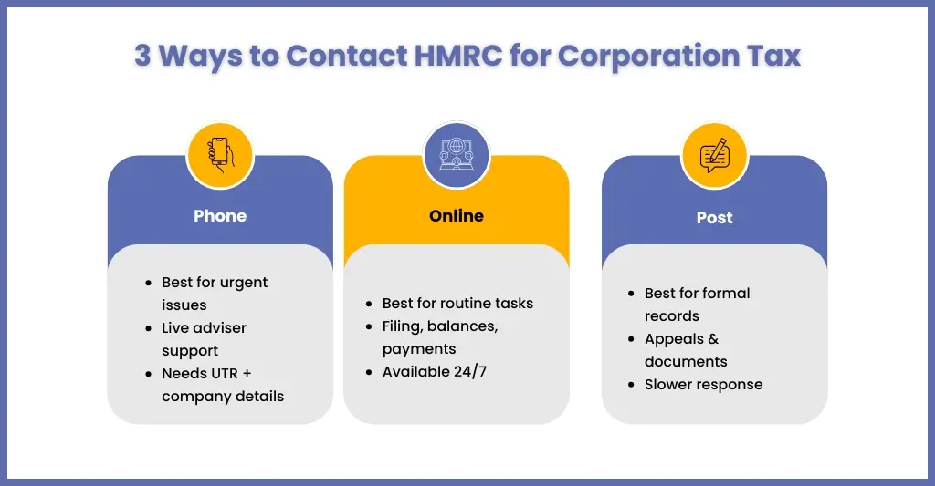 When it comes to Corporation Tax, HMRC gives you three main ways to get in touch: phone, online, and post.