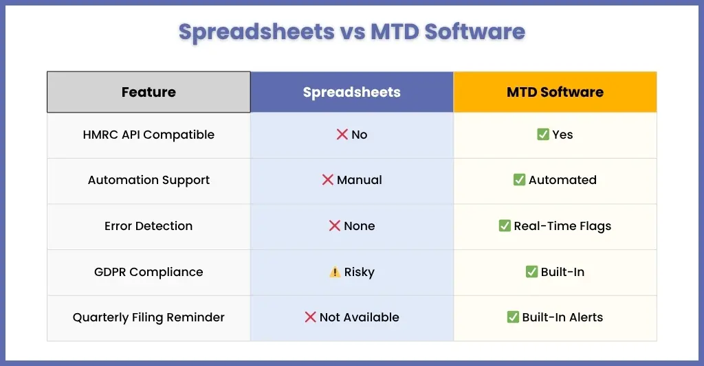 Yes, you can use spreadsheets only if you have bridging software. It is important to note that HMRC does not allow direct VAT submissions from Excel or other spreadsheet tools unless they’re connected to MTD-compatible bridging software that can transmit data via HMRC’s API.